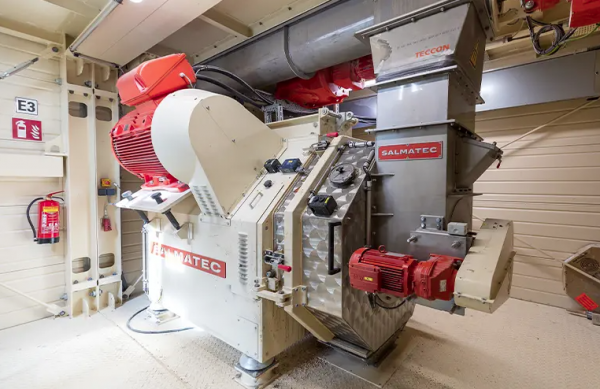 材料經(jīng)過超大的篩網(wǎng)由垂直螺旋輸送機(jī)輸送到二層的進(jìn)料倉。隨后,材料進(jìn)入位于第三層的Salmatec壓縮成型機(jī),以生產(chǎn)6毫米的顆粒。淀粉粘合劑也用于生產(chǎn)。